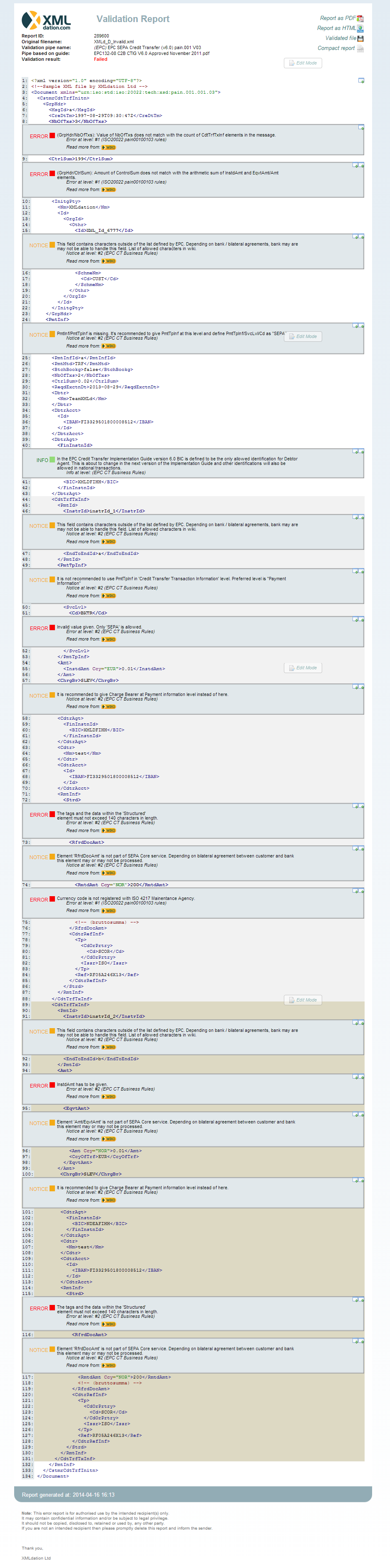As visible from the report, the service returns multiple errors and notices into relevant places of the XML file. Most of the errors also include a "read more" wikilink.